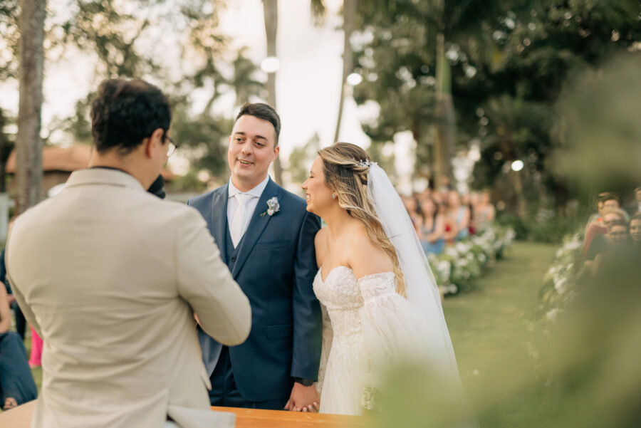 Ali Nathalia teve certeza de que gostaria de se casar ao ar livre em uma celebração personalizada. “O Fábio pôde transmitir muita emoção e sensibilidade a todos os convidados, mas, lembro de me surpreender com a personalidade e a história dos próprios noivos estando ali presentes e servindo de pano de fundo para conduzir a cerimônia e esse dia tão marcante na vida do casal”, diz.