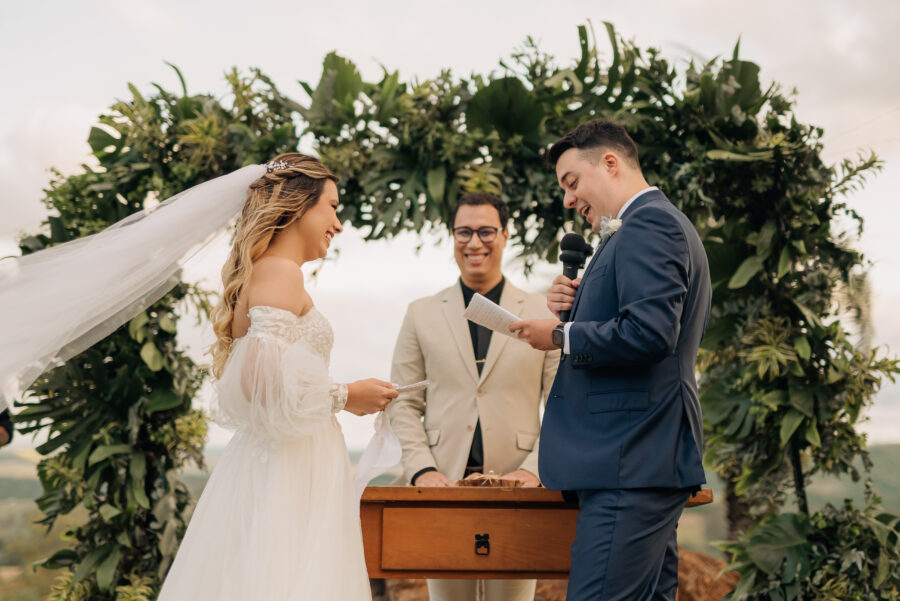 Nathalia diz que não se arrepende da escolha. “Com certeza foi mais uma escolha acertada em nosso casamento, fez toda a diferença ter alguém que nos transmitisse confiança e tranquilidade naquele momento no altar, que soubesse lidar com certos imprevistos – apesar do pôr do sol lindo, ventava muito na hora da celebração – e ainda conseguir contar nossa história e passar uma mensagem linda que lembraremos pra sempre com muito carinho”, afirma. “Indico e indicaria mil vezes! No fim, só tenho a agradecer por todo o carinho conosco e que ele continue celebrando muitos e muitos casamentos, inclusive na família.”